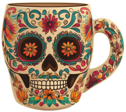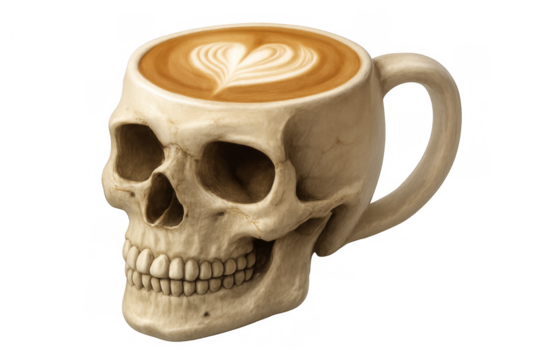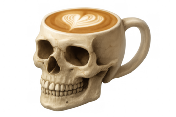 Skull mug filled with coffee with heart shaped latte art on transparent background