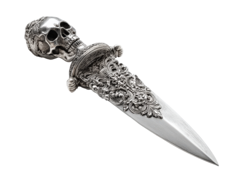 Ornate silver dagger with a detailed skull pommel and intricate baroque-style carvings on the hilt.