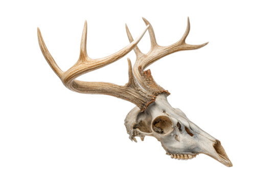 A weathered bull skull with aged horns, isolated on white or transparent background. PNG