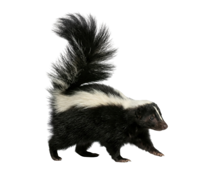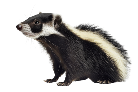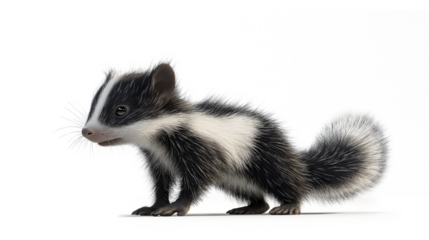 Skunk walking, side view, black and white striped mammal with furry tail, wildlife animal portrait on transparent background