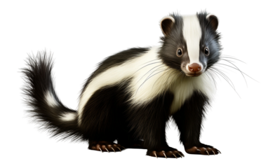 A black and white skunk with a bushy tail stands on a transparent background, isolated on transparent background