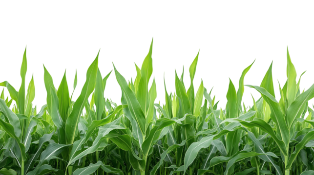 Green corn or cob plant leaves field, isolated on transparent background, symbolizing agriculture farming, crop growth, and fresh rural maize harvest.