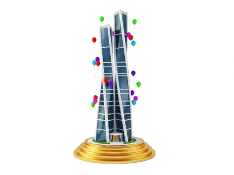 A colorful illustration of a building with confetti on a gold base isolated on transparent background