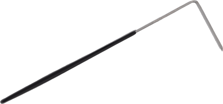 A slanted square-blade pottery tool with long black handle on white background