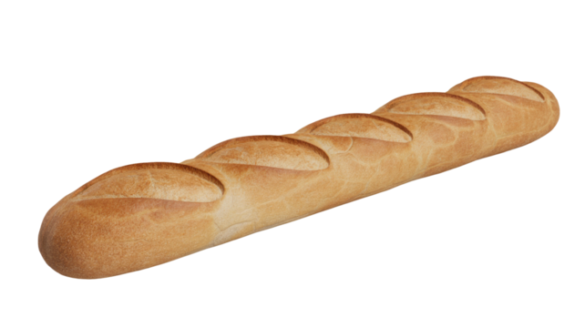 A golden-brown baguette with characteristic diagonal slashes, perfect for French cuisine, sandwiches, or as a delicious side. Isolated on transparent. background removed