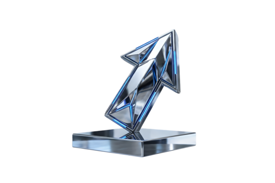 Dynamic 3D metallic arrow symbol with reflective blue accents, representing upward progress, business growth, and future achievement in a sleek, modern design