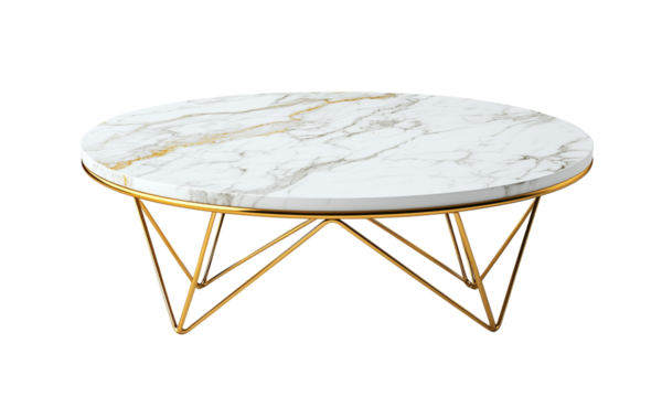 Elegant round coffee table with a luxurious marble top and sleek golden metal frame, perfect for modern living room décor and stylish furnishings, isolated transparent background