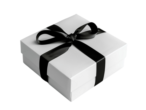 Elegant white gift box with a sleek black ribbon bow. Perfect for special occasions, celebrations, and gift-giving moments.