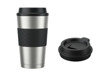 Isolated Stainless Steel Travel Mug with Lid, Featuring a Textured Grip and Sleek Design on a White Background