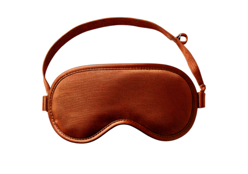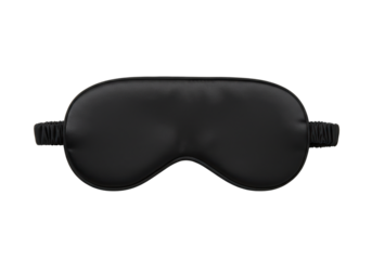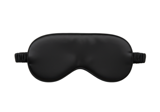 A close up of a black sleep mask with an elastic strap  in a studio setting isolated on transparent background