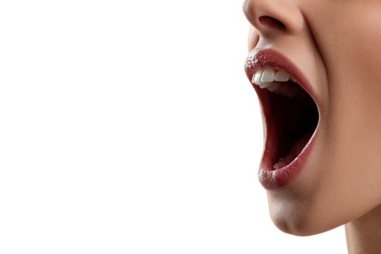 Woman yawning widely, covering her mouth with her hand in exhaustion on a transparent background