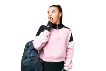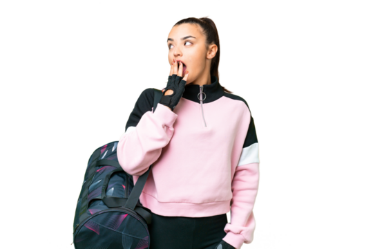 Young sport woman with sport bag over isolated chroma key background yawning and covering wide open mouth with hand