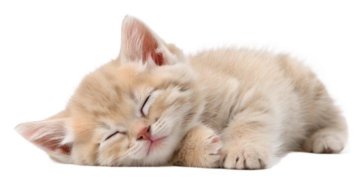 Sleepy kitten lying down calmly. Cute kitten isolated on transparent background.