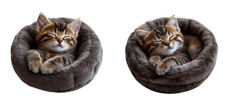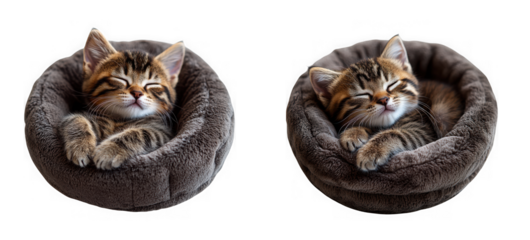 Two adorable tabby kittens sleeping peacefully in soft, fluffy brown pet beds, isolated on transparent background
