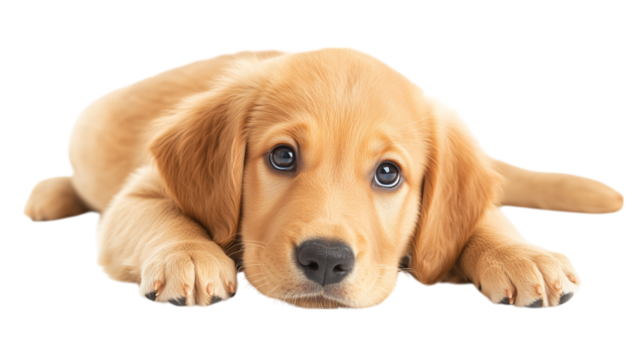 Cute 7 weeks old Labrador dog puppy, laying down facing front. Head down looking tired beside camera. Isolated cutout on a transparent background.