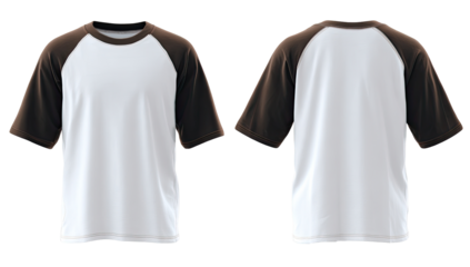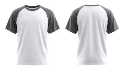 Front and back view of a blank white t-shirt with dark gray raglan sleeves