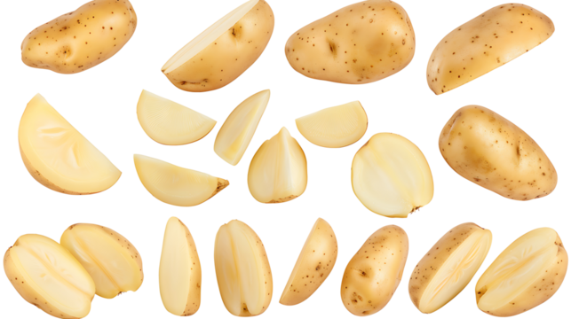 Potato potatoes vegetable, many angles and view side top front cluster group slice cut isolated on transparent background cutout, PNG file. Mockup template for artwork graphic design