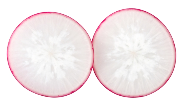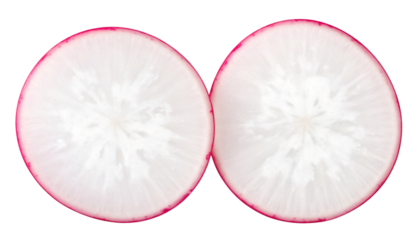 Freshly sliced radishes with vibrant pink edges on light background, showcasing healthy vegetables and natural food freshness on transparent background