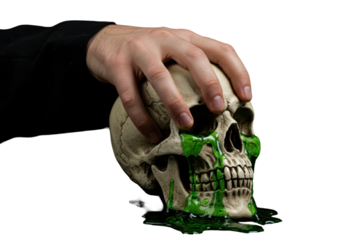 Isolated human skull gripped by hand with green liquid flowing, Halloween horror theme