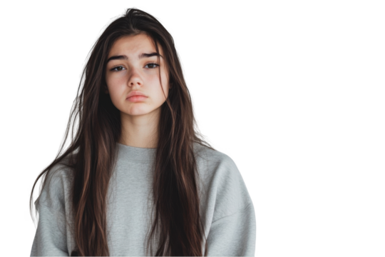 A young woman with long brown hair is looking at the camera, frowning and sad, isolated on a white background