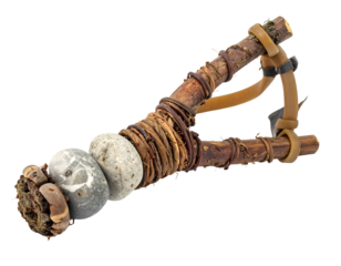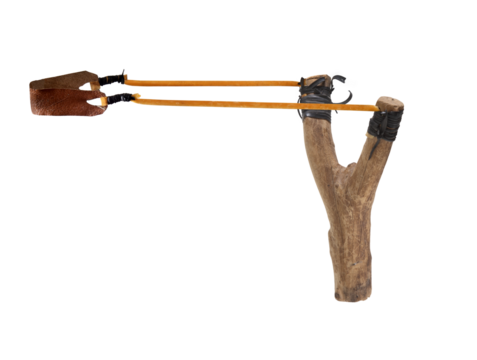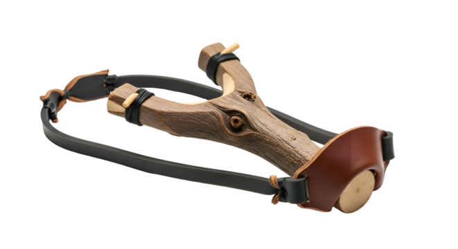 Classic wooden slingshot with leather thongs, isolated on transparent background, ready for launching projectiles