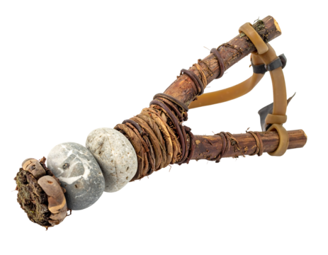 Wooden slingshot with two grey stones and elastic bands isolated on transparent background