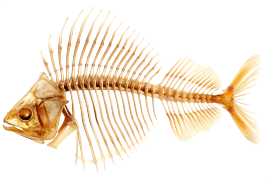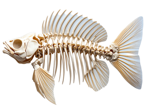 Fish skeleton showing bones and fins isolated on a transparent background white background