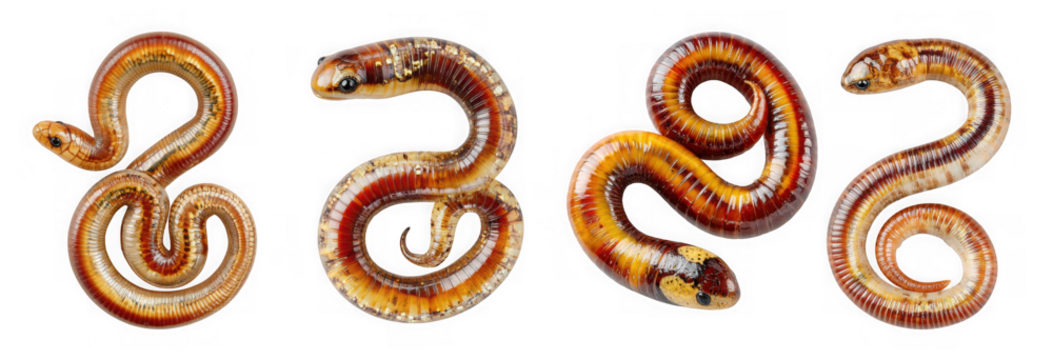 Four earthworms curled into abstract shapes, isolated on transparent background