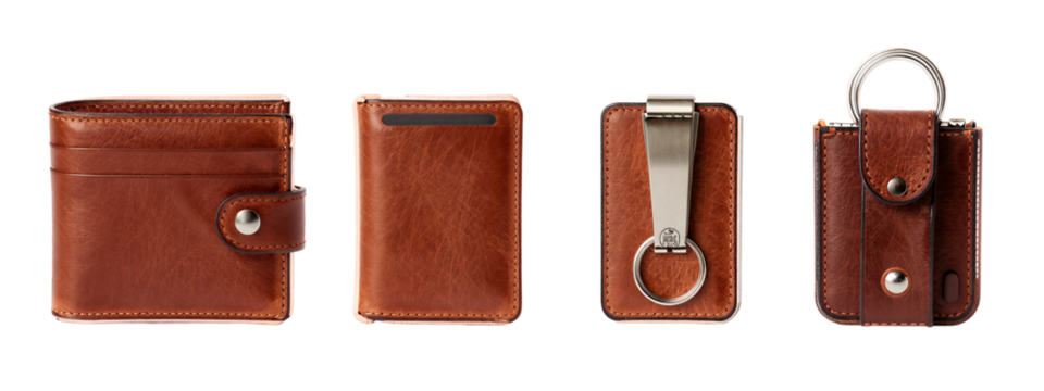 Photograph of four brown leather wallets, each showing different views: closed with button, open with card slot, with metal strap, and with keyring.
