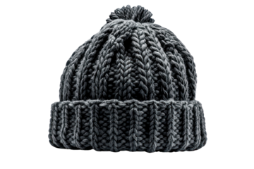 Close-up of a gray knitted winter hat with a pom-pom. Perfect for cold weather, cozy, warm, and stylish accessory.
