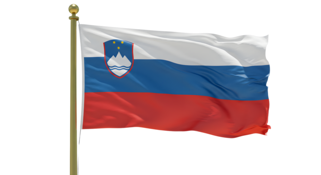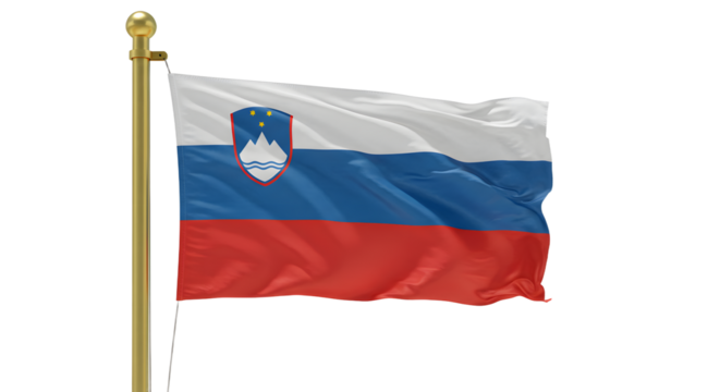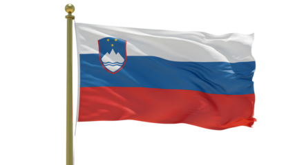 Waving Slovenia national flag on flagpole against white background, Slovenian country symbol, perfect for patriotic and cultural events