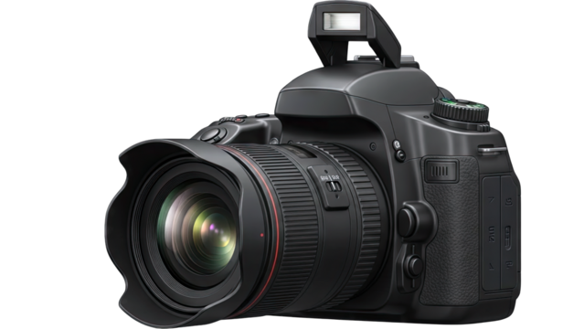 A sleek black digital slr camera with a prominent lens is displayed against a transparent background