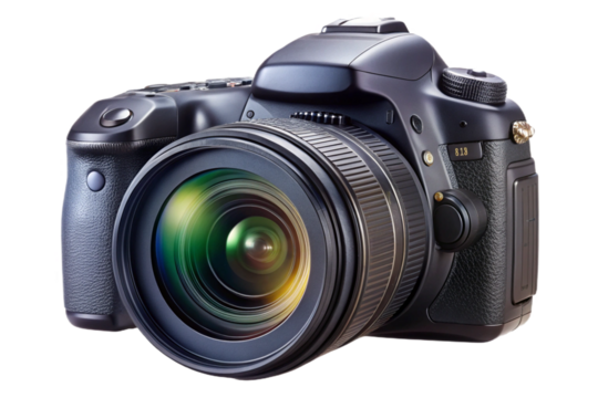 Professional digital slr camera with large lens and reflective elements isolated on transparent background