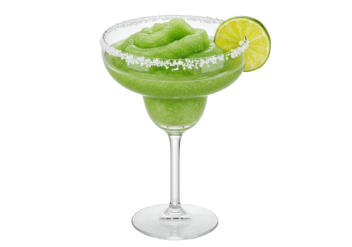 Isolated frozen lime margarita cocktail drink with sugared rim and slice garnish, clear glass