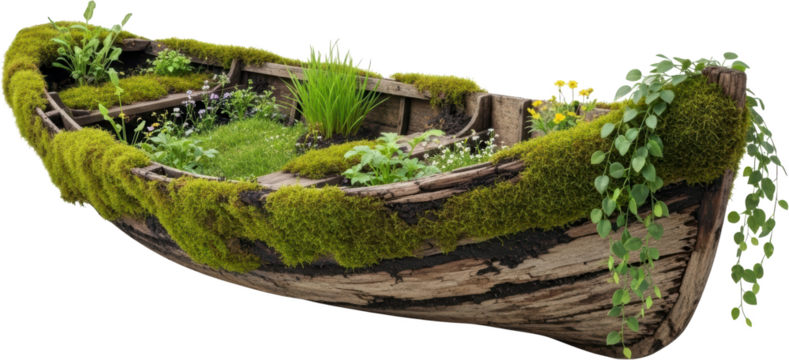 A weathered wooden rowboat overflowed with lush green moss and a variety of small plants and delicate white and yellow flowers creatively repurposed as a garden planter