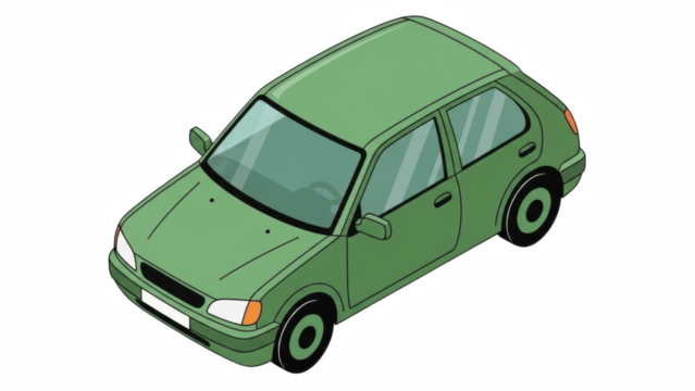 Isometric green compact hatchback car – small urban vehicle illustration ideal for city driving, student transport, car‑sharing, rentals, ride‑hailing apps, navigation graphics, and eco‑friendly mobil