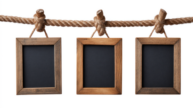 Mini Chalkboards Hanging on Rope with Natural Wood Frames isolated on transparent background Remove png, Clipping Path, pen tool