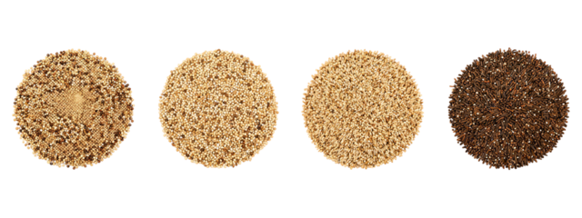 Four circular piles of different types of small seeds or grains, arranged horizontally. Each pile is a different color: light brown, beige, golden brown, and dark brown.