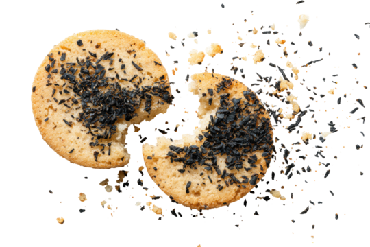 Two round cookies, halves, with dark sprinkles, on black background, with crumbs
