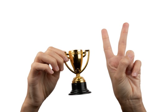 A hand holding a sign that says vote and a small american flag, with another hand making a peace sign, isolated on transparent background