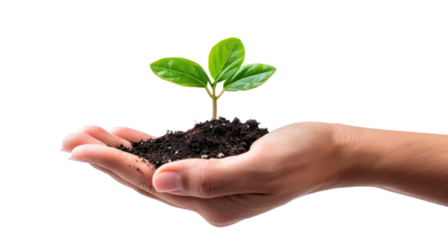 Hand holding a small plant with green leaves and soil. The image, set against a transparent background, symbolizes growth, nurturing, and environmental care.