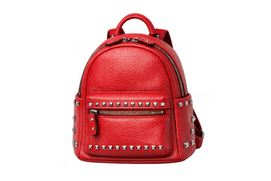 Red pebbled leather mini backpack with silver studs and zippers, fashionable women's accessory on transparent background