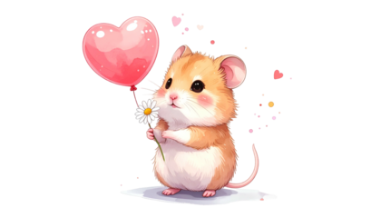 Adorable cartoon hamster holding a heart balloon and a daisy, surrounded by hearts