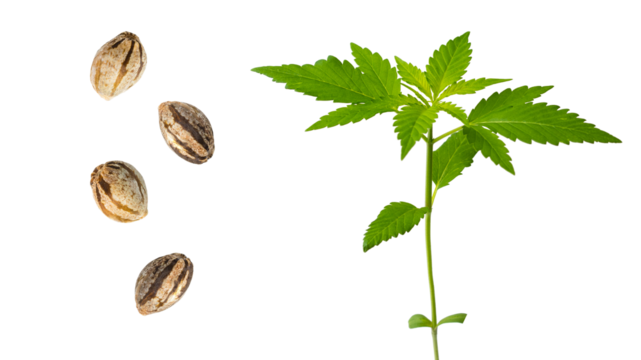 Cannabis seeds. Sprout hemp growing. Medical marijuana. Cannabis plant sativa or indica. Legalization and decriminalization drugs. Green leaf. Macro close-up on white background.