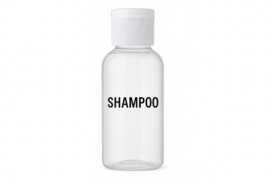 Compact plastic shampoo bottle, white flip-top lid, transparent backdrop, suitable for traveling, personal care routine