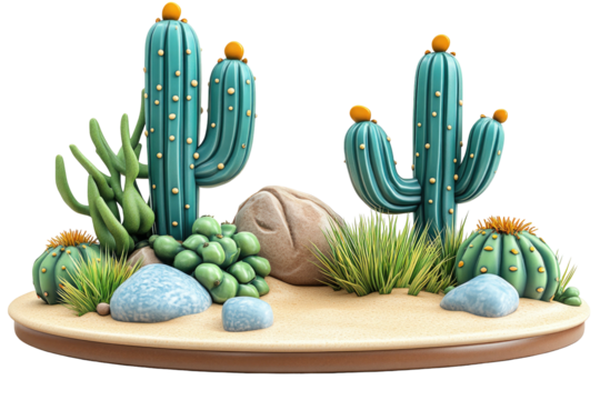 Desert scene with stylized cacti, succulents, and stones