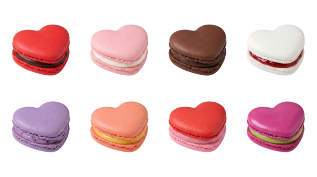 Heart shaped macaron set including strawberry, chocolate, vanilla, lavender, and citrus flavors isolated. Gourmet french dessert collection for Valentine's Day.