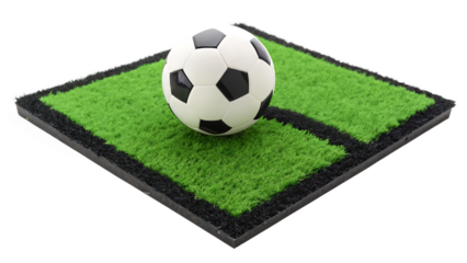 Black and white soccer ball resting on a small patch of green artificial turf with black trim isolated on a transparent background