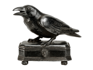 Antique dark metal sculpture of a cawing raven perched on a small ornate chest.