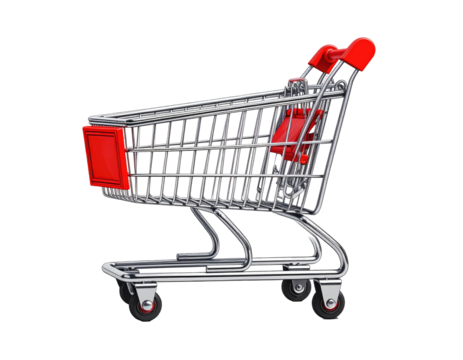 A miniature shopping cart with red accents on a black backdrop on transparent background